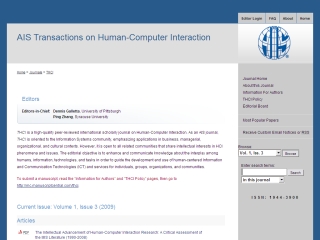 AIS Transactions on Human-Computer Interaction (THCI) http://aisel.aisnet.org/thci/ AIS Transactions on Human-Computer Interaction (THCI) is a high- quality peer-reviewed international scholarly journal on Human-Computer Interaction. As an AIS journal,THCI is oriented to the Information Systems community, emphasizing applications in business, managerial, organizational, and cultural contexts. However, it is open to all related communities that share intellectual interests in HCI phenomena and issues. The editorial objective is to enhance and communicate knowledge about the interplay among humans, information, technologies, and tasks in order to guide the development and use of human-centered Information and Communication Technologies (ICT) and services for individuals, groups, organizations, and communities. Topics of interest to THCI include but are not limited to the following: * The behavioral, cognitive, motivational and affective aspects of human and technology interaction * User task analysis and modeling; fit between representations and task types * Digital documents/genres; human information seeking and web navigation behaviors; human information interaction; information visualization * Social media; social computing; virtual communities * Behavioral information security and information assurance; privacy and trust in human technology interaction * User interface design and evaluation for various applications in business, managerial, organizational, educational, social, cultural, non-work, and other domains * Integrated and/or innovative approaches, guidelines, and standards or metrics for human centered analysis, design, construction, evaluation, and use of interactive devices and information systems * Information systems usability engineering; universal usability * The impact of interfaces/information technology on people's attitude, behavior, performance, perception, and productivity * Implications and consequences of technological change on individuals, groups, society, and socio-technical units * Software learning and training issues such as perceptual, cognitive, and motivational aspects of learning * Gender and information technology * The elderly, the young, and special needs populations for new applications, modalities, and multimedia interaction * Issues in HCI education The language for the journal is English.